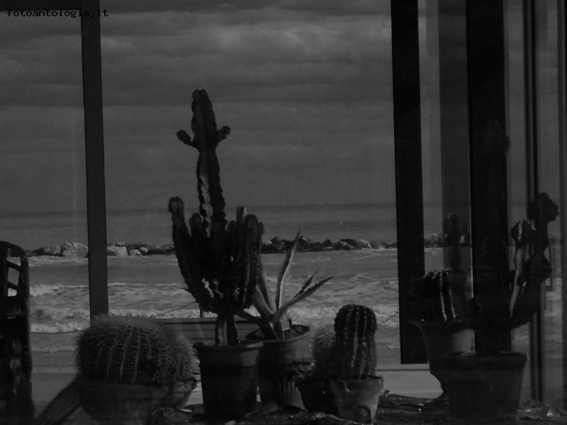 Le piante sembrano intente a commentare sottovoce la giornata grigia e il mare mosso. Lievemente inclinate, riverenti verso ciò che osservano al di là del vetro. Il frangersi dell'onda in battigia è denso, corposo; è percepibile quasi tattilmente il rimescolarsi di acqua e sabbia